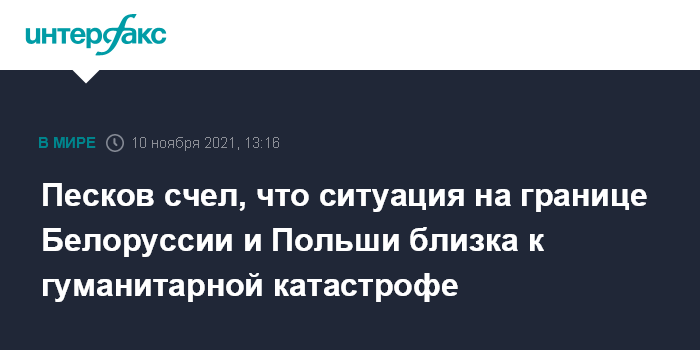 "Сейчас налицо, конечно же, надвигающаяся гуманитарная катастрофа, речь идёт о жизни и здоровье нескольких тысяч людей, которые являются беженцами и отрыто заявляют о том, что они хотят следовать дальше на пространство ЕС, они даже не хотят оставаться и в Польше, говорят они", - сказал Песков журналистам в среду, отвечая на вопросы о ситуации на польско-белорусской границе.