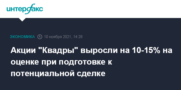 Москва. 10 ноября. INTERFAX.RU - Обыкновенные акции ПАО "Квадра" выросли в ходе торгов на Московской бирже в среду на 15,4% (до 0,935 копейки за штуку), а привилегированные бумаги подорожали на 10,1% (до 0,8635 копейки за штуку) на новостях об оценке компании в рамках подготовки к потенциальной сделке.