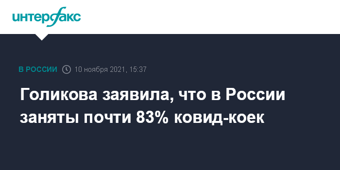 Москва. 10 ноября. INTERFAX.RU - В России, по данным на утро 9 ноября, было занято 82,8% инфекционных коек для больных коронавирусом, сообщила на совещании у президента Владимира Путина вице-премьер Татьяна Голикова.