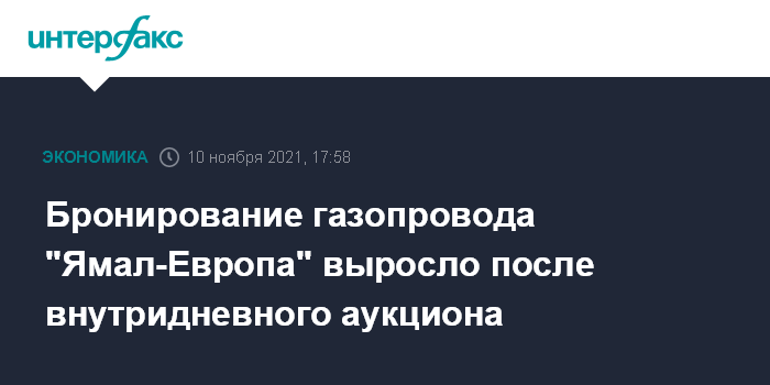 Москва. 10 ноября. INTERFAX.RU - Бронирование газопровода "Ямал-Европа" выросло после внутридневного аукциона.