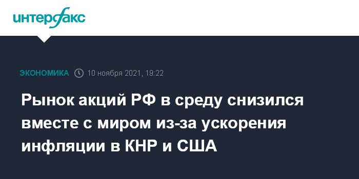 Рынок акций РФ в среду снизился вместе с миром из-за ускорения инфляции в КНР и США