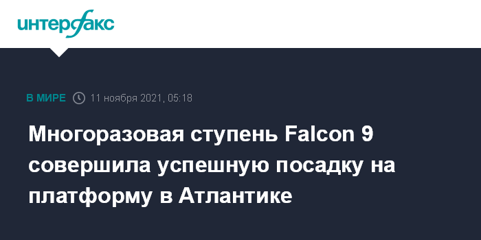 Москва. 11 ноября. INTERFAX.RU - Многоразовая первая ступень американской ракеты-носителя Falcon 9, стартовавшей в четверг по московскому времени на орбиту с пилотируемым кораблем Crew Dragon-3, совершила успешную управляемую посадку на плавучую платформу в Атлантике, сообщила компания-разработчик SpaceX.