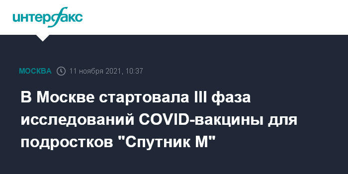 Москва. 11 ноября. INTERFAX.RU - Третий этап клинических исследований вакцины от коронавируса для подростков "Спутник М" начался в столице, сообщила журналистам заммэра Москвы по вопросам социального развития Анастасия Ракова.