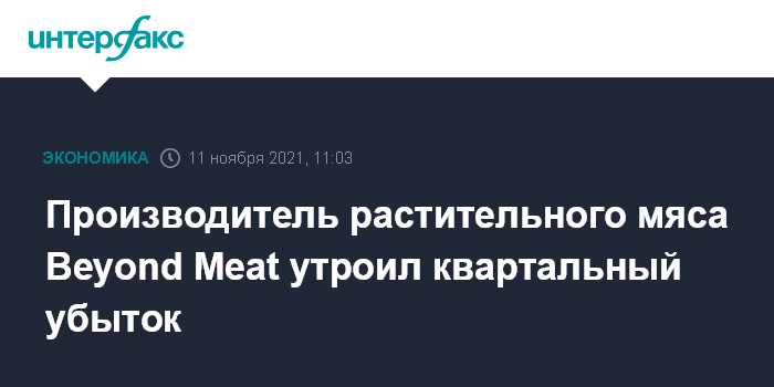 Москва. 11 ноября. INTERFAX.RU - В III финансовом квартале (завершился 2 октября) американский производитель растительных заменителей мяса Beyond Meat увеличил чистый убыток в 2,8 раза, до $54,816 млн, или 87 центов в расчете на акцию, против $19,285 млн, или 31 цента на акцию годом ранее.