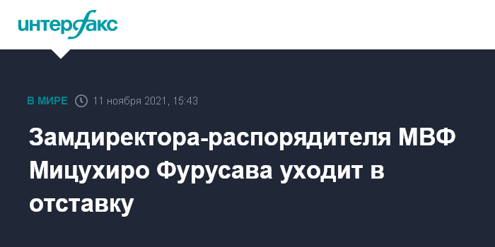 Москва. 11 ноября. INTERFAX.RU - Заместитель директора-распорядителя Международного валютного фонда (МВФ) Мицухиро Фурусава уйдет в отставку 30 ноября, сообщается в пресс-релизе организации.