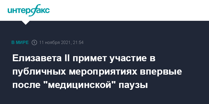 Согласно Букингемскому дворцу, королева 14 ноября будет присутствовать на мероприятиях у военного мемориала Кенотаф по случаю Воскресенья памяти, когда в Великобритании чтят память жертв Первой и Второй мировой войны, а также более поздних военных конфликтов.