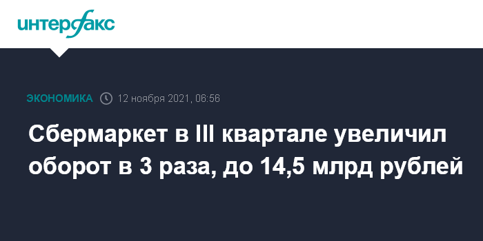 Москва. 12 ноября. INTERFAX.RU - Сервис доставки продуктов и непродовольственных товаров "Сбермаркет" в III квартале 2021 года увеличил оборот в три раза по сравнению с аналогичным показателем за прошлый год, до 14,5 млрд рублей (показатель GMV с промо и НДС).