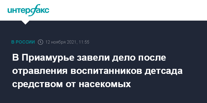 Москва. 12 ноября. INTERFAX.RU - Уголовное дело возбуждено в Амурской области после отравления трех детей средством от насекомых в одном из детских садов, в настоящее время здоровью воспитанников ничто не угрожает.