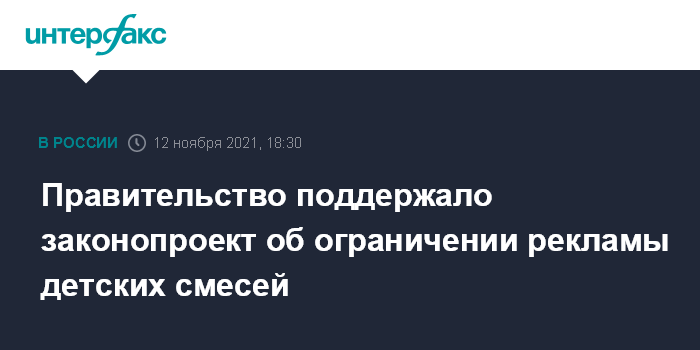Москва. 12 ноября. INTERFAX.RU - Правительство направило в Госдуму положительный отзыв на депутатский законопроект, который запрещает распространение в РФ информации об адаптивных молочных детских смесях, за исключением медицинских выставок и специализированных изданий.