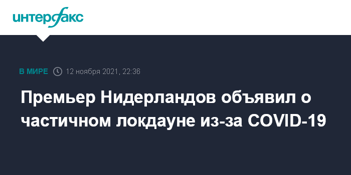 Москва. 12 ноября. INTERFAX.RU - Премьер-министр Нидерландов Марк Рютте в пятницу вечером объявил о введении в стране на три недели частичного локдауна на фоне нового антирекорда по заболеваемости COVID-19 - накануне было выявлено более 16,3 тыс. новых случаев, сообщает NL Times.