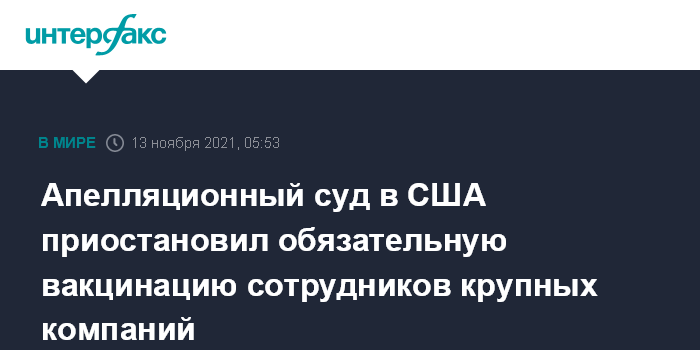 Москва. 13 ноября. INTERFAX.RU - Апелляционный суд принял решение приостановить распоряжение президента США Джо Байдена о том, что компании со 100 и более сотрудниками должны обеспечить их обязательную вакцинацию от COVID-19, сообщает The New York Times.
