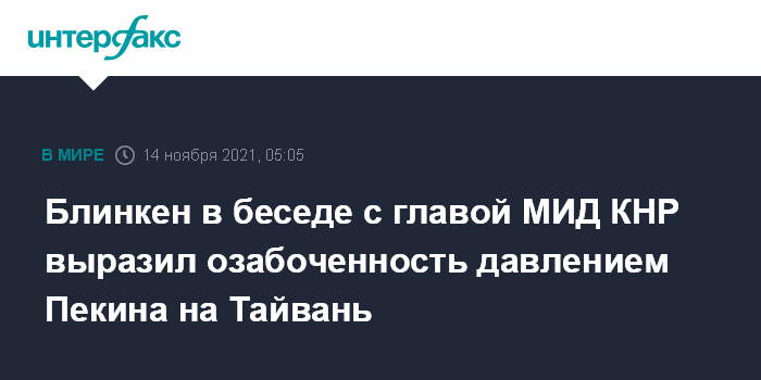 Москва. 14 ноября. INTERFAX.RU - Соединенные Штаты озабочены действиями Пекина в отношении Тайваня и выступают за мир и стабильность в районе Тайваньского пролива, заявил в состоявшейся накануне телефонной беседе с министром иностранных дел КНР Ван И госсекретарь США Энтони Блинкен.