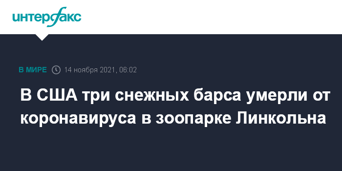 Москва. 14 ноября. INTERFAX.RU - В США три снежных барса умерли в детском зоопарке города Линкольн (штат Небраска) от осложнений, вызванных коронавирусом. Об этом пишет Associated Press.