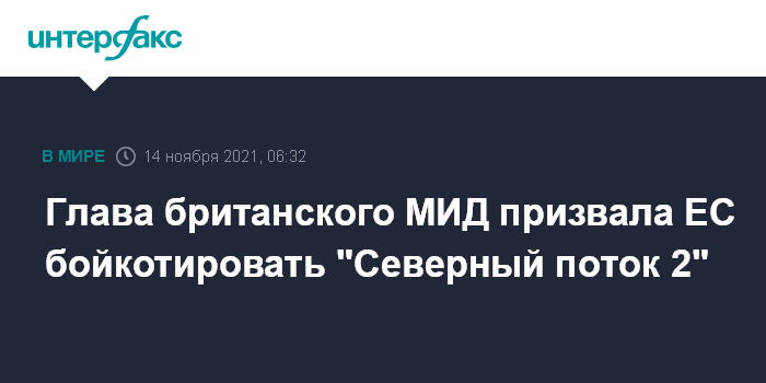 Москва. 14 ноября. INTERFAX.RU - Министр иностранных дел Великобритании Лиз Трасс призвала Европейский союз укрепить свои связи с другими странами-единомышленниками и пересмотреть зависимость от России в поставках газа, заблокировав сертификацию газопровода "Северный поток-2", сообщила британская Sunday Telegraph.