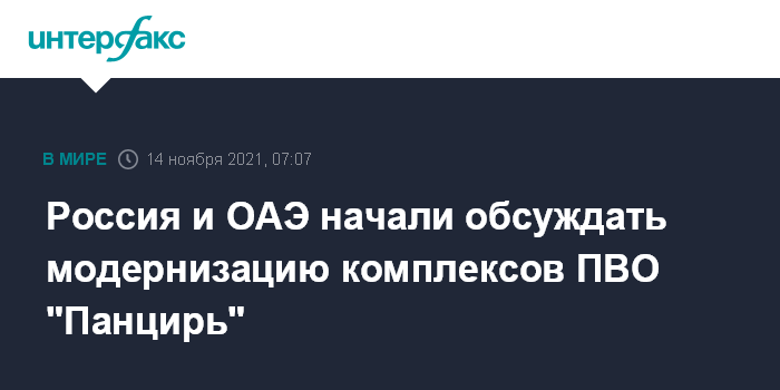Москва. 14 ноября. INTERFAX.RU - Россия и Объединенные Арабские Эмираты обсуждают модернизацию комплексов противовоздушной обороны (ПВО) ближнего действия "Панцирь-С1", которые были поставлены в эту страну, сообщил директор Федеральной службы по военно-техническому сотрудничеству (ФСВТС) РФ Дмитрий Шугаев.