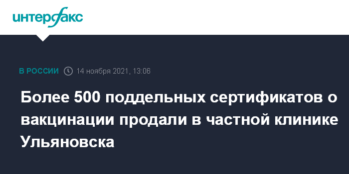 Москва. 14 ноября. INTERFAX.RU - Факт продажи более 500 поддельных сертификатов о вакцинации от коронавируса выявили в одной из частных клиник Ульяновска, сообщил губернатор Ульяновской области Алексей Русских в воскресенье.