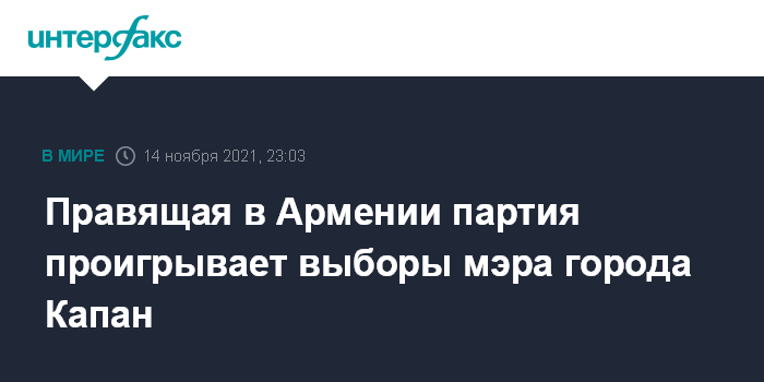 Москва. 14 ноября. INTERFAX.RU - Возглавляемая премьер-министром Армении Николом Пашиняном правящая партия "Гражданский договор" проигрывает выборы мэра города Капан Сюникской области на юге республики.
