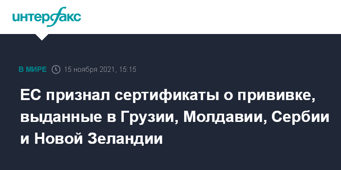 Москва. 15 ноября. INTERFAX.RU - Еврокомиссия в понедельник решила признать на территории стран ЕС сертификаты о вакцинации от коронавируса COVID-19, выдаваемые в Грузии, Молдавии, Сербии и Новой Зеландии, говорится в пресс-релизе, распространенном в понедельник ЕК.
