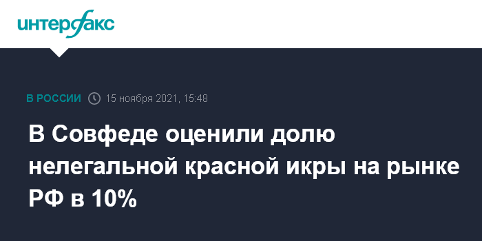 Москва. 15 ноября. INTERFAX.RU - Доля нелегальной красной икры на российском рынке достигает 10%, сообщил в понедельник первый заместитель председателя Совета Федерации Андрей Яцкин на заседании Совета по вопросам АПК и природопользования при верхней палате парламента, посвященном борьбе с незаконным, несообщаемым и нерегулируемым промыслом (ННН-промысел).