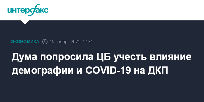 Москва. 15 ноября. INTERFAX.RU - ЦБ стоит больше внимания уделять демографическим процессам в обществе, на которые повлиял COVID-19. Речь идет об избыточной смертности и цифровой миграции. Оба эти фактора могут оказать влияние на ДКП, говорится в совместном заключении трех комитетов финансово-экономического блока Госдумы.