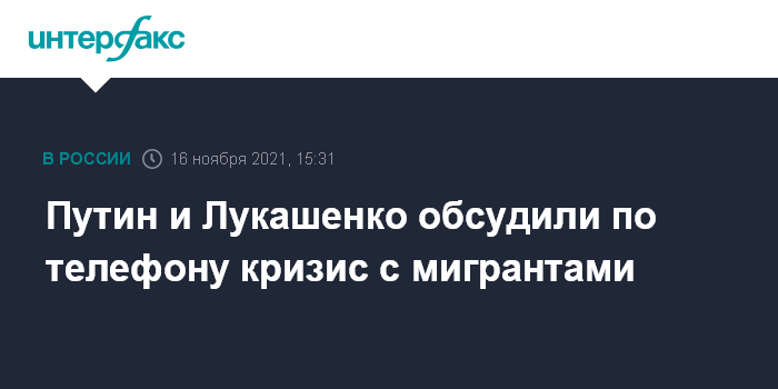 Москва. 16 ноября. INTERFAX.RU - Президенты России и Белоруссии Владимир Путин и Александр Лукашенко обсудили по телефону ситуацию с мигрантами на белорусско-польской границе с учетом вчерашнего разговора Лукашенко с и.о. канцлера ФРГ Ангелой Меркель. Об этом сообщила пресс-служба Кремля.