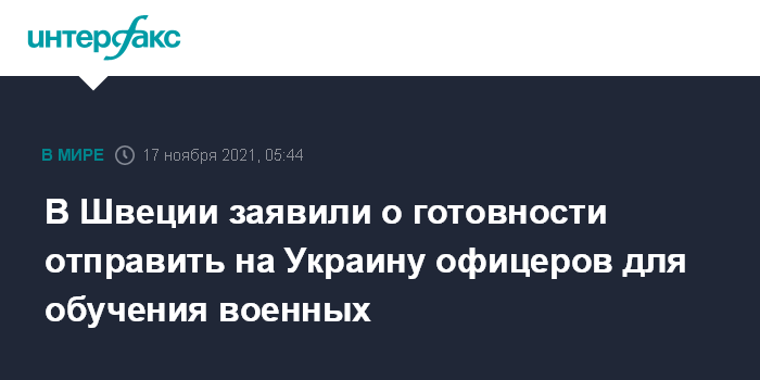Москва. 17 ноября. INTERFAX.RU - Министр обороны Швеции Питер Хултквист заявил о готовности отправить шведских военнослужащих на Украину, передает Sveriges Radio.