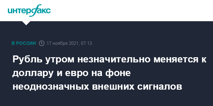 По мнению экспертов "Интерфакс-ЦЭА", рубль незначительно меняется к доллару и евро на старте торгов 17 ноября на фоне неоднозначных внешних сигналов. Давление на нацвалюту оказывают негативные сигналы с мировых рынков капитала, в том числе нефтяных площадок. В то же время, снижение геополитических рисков вокруг РФ препятствует снижению российской валюты.