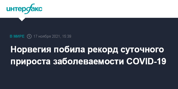Москва. 17 ноября. INTERFAX.RU - В Норвегии выявили рекордный с начала пандемии суточный прирост заболеваемости коронавирусной инфекцией - 2552 новых случаев заражения за вторник, сообщает Aftonposten.