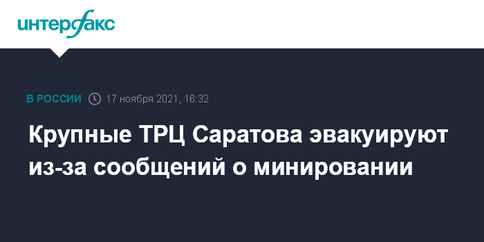 Москва. 17 ноября. INTERFAX.RU - В Саратове полиция и экстренные службы проверяют крупные торгово-развлекательные центры после того, как эти предприятия получили электронные письма о заложенных в зданиях бомбах, сообщил "Интерфаксу" информированный источник.