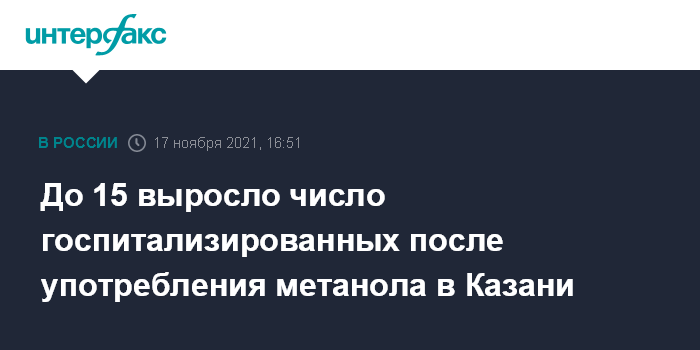Москва. 17 ноября. INTERFAX.RU - Число госпитализированных после отравления метанолом в Казани увеличилось до 15, сообщила "Интерфаксу" главный токсиколог Минздрава Татарстана, заведующая отделением токсикологии городской клинической больницы №7 Казани Алия Насибуллина.