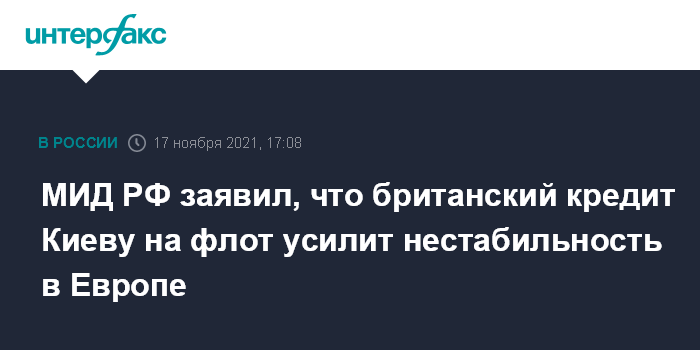 Москва. 17 ноября. INTERFAX.RU - Намерение Великобритании предоставить Украине кредит для развития и укрепления ВМС будет способствовать росту нестабильности в Европе, заявила официальный представитель МИД РФ Мария Захарова.