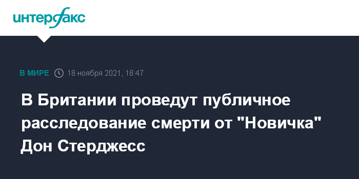 Москва. 18 ноября. INTERFAX.RU - Глава МВД Великобритании Прити Пател анонсировала проведение общественного расследования смерти 44-летней Дон Стерджесс, которая летом 2018 года отравилась в Эймсбери нервно-паралитическим веществом группы "Новичок".