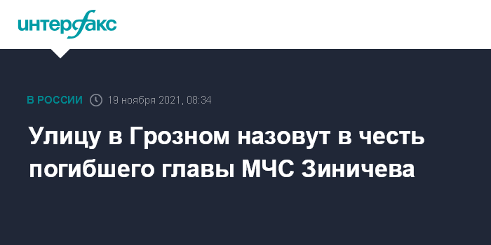 "От Алихана Цакаева прозвучало предложение переименовать улицу Лагерную в Грозном, примыкающую к зданию управления МЧС РФ по ЧР, в улицу имени трагически погибшего в сентябре этого года главы МЧС РФ Евгения Зиничева с установкой мемориальной доски. Я одобрил это предложение", - написал Кадыров в своем телеграм-канале.