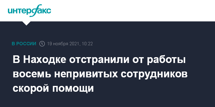 Москва. 19 ноября. INTERFAX.RU - В Находке из-за отсутствия прививок от коронавируса отстранены от работы восемь сотрудников станции скорой помощи, сообщили в Минздраве Приморья. Там подчеркнули, что это единственный случай на весь регион.