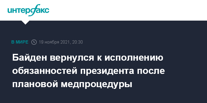 Москва. 19 ноября. INTERFAX.RU - Президент США Джо Байден вернулся к исполнению обязанностей после того, как передал их на некоторое время вице-президенту Камале Харрис из-за медицинской процедуры, сообщила в пятницу пресс-секретарь Белого дома Джен Псаки.