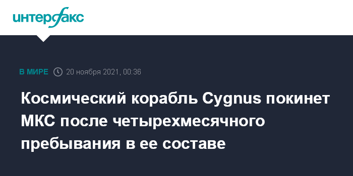 Москва. 20 ноября. INTERFAX.RU - Американский грузовой космический корабль Cygnus ("Сигнус") корпорации Northrop Grumman после четырехмесячного пребывания в составе Международной космической станции (МКС) в субботу должен отстыковаться от нее и отправиться в автономный полет, сообщает Национальное управление США по аэронавтике и исследованию космического пространства (НАСА).