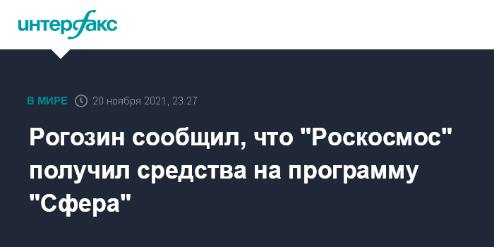 Москва. 20 ноября. INTERFAX.RU - "Роскосмос" получил первые средства на создание спутниковой системы "Сфера", сообщил глава госкорпорации Дмитрий Рогозин.