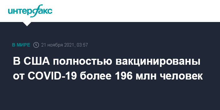 Москва. 21 ноября. INTERFAX.RU - По распространенным данным Центров США по контролю и профилактике заболеваний (CDC), на утро субботы в Соединенных Штатах полностью вакцинированы 196 млн 128 тыс. 496 человек.