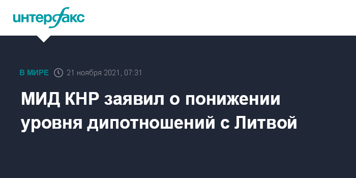 Москва. 21 ноября. INTERFAX.RU - В связи с открытием в Литве официального представительства Тайваня Китай принял решение о понижении уровня дипотношений между двумя странами до уровня поверенных в делах, сообщил МИД КНР.