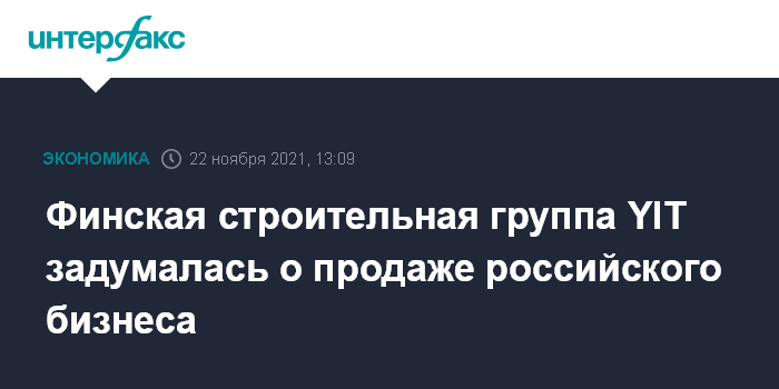 Москва. 22 ноября. INTERFAX.RU - Финская домостроительная группа YIT может продать свой российский бизнес. Как говорится в сообщении компании, совет директоров YIT "в целях оптимизации использования капитала" принял решение изучить "стратегические опции" относительно бизнеса в РФ, среди этих опций - потенциальная продажа.