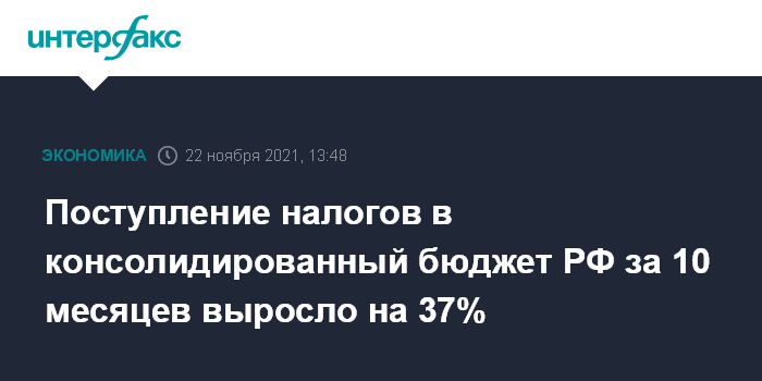 Поступление налогов в консолидированный бюджет РФ за 10 месяцев выросло на 37%