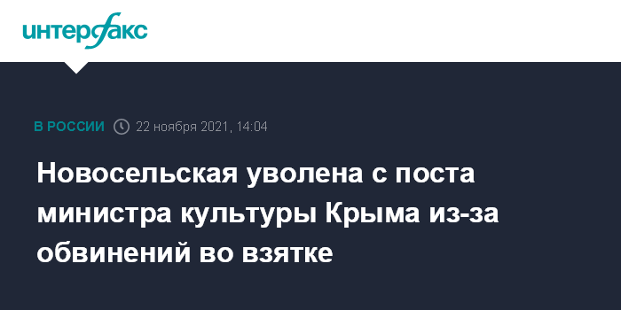 Москва. 22 ноября. INTERFAX.RU - Глава Крыма Сергей Аксенов подписал указ об увольнении с должности министр культуры республики Арины (Веры) Новосельской, которую обвиняют в получении крупной взятки.