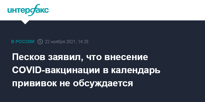 Москва. 22 ноября. INTERFAX.RU - Тема внесения вакцинации от коронавируса в национальный календарь прививок официально не обсуждается, заявил пресс-секретарь президента РФ Дмитрий Песков.