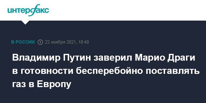 Москва. 22 ноября. INTERFAX.RU - Президент РФ Владимир Путин в телефонном разговоре с председателем Совета министров Италии Марио Драги подтвердил готовность России на долгосрочной основе обеспечивать бесперебойные поставки природного газа в Европу, сообщила пресс-служба Кремля.
