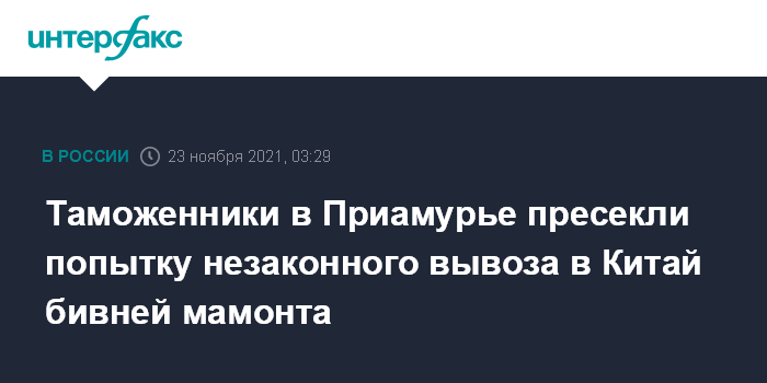 Москва. 23 ноября. INTERFAX.RU - Сотрудники таможни на пункте пропуска Благовещенск-Хэйхэ (Амурская область) обнаружили на российском судне бивни мамонта, которые незаконно пыталась вывезти российская компания в КНР, сообщает Хабаровская таможня.
