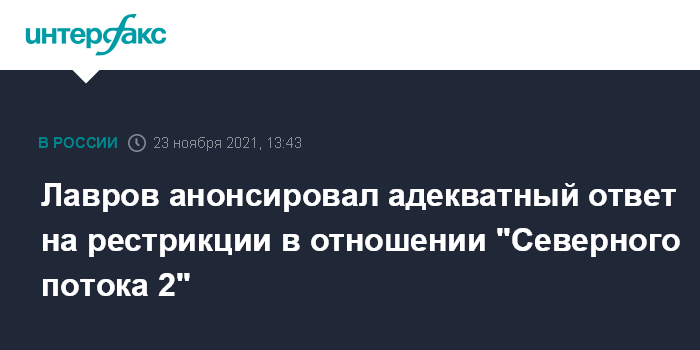 Москва. 23 ноября. INTERFAX.RU - Россия будет адекватно реагировать на незаконные рестрикции против газопровода "Северный поток 2", заявил министр иностранных дел РФ Сергей Лавров.