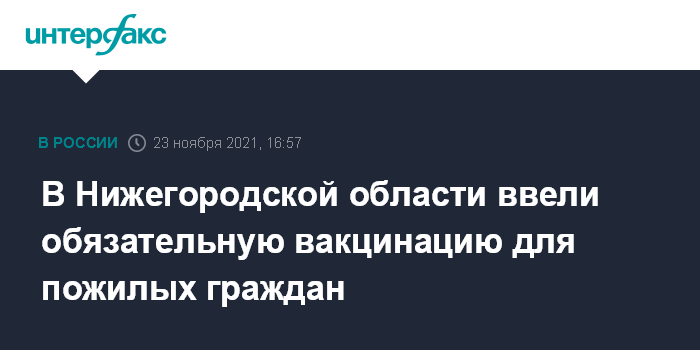 Москва. 23 ноября. INTERFAX.RU - Главный государственный санитарный врач по Нижегородской области Наталия Кучеренко постановила ввести в регионе обязательную вакцинацию от коронавирусной инфекции для граждан 60 лет и старше, сообщает пресс-служба регионального управления Роспотребнадзора во вторник.