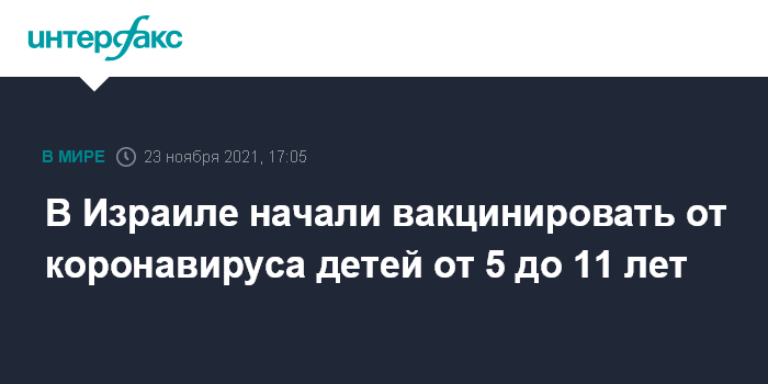 Москва. 23 ноября. INTERFAX.RU - В Израиле со вторника начали вакцинировать от COVID-19 детей в возрасте от 5 до 11 лет, сообщает агентство Associated Press.