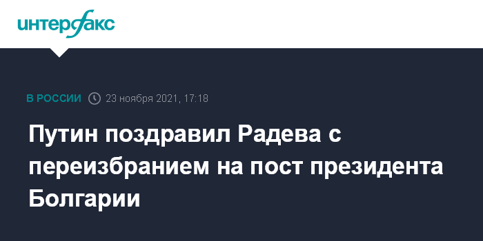 Москва. 23 ноября. INTERFAX.RU -- Президент Российской Федерации Владимир Путин направил поздравительную телеграмму Румену Радеву по случаю его переизбрания на пост президента республики Болгарии, сообщила во вторник пресс-служба Кремля.