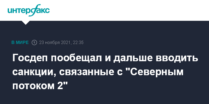 Москва. 23 ноября. INTERFAX.RU - США продолжат следить за реализацией проекта "Северный поток 2" и при необходимости - вводить дополнительные санкции, заявил во вторник представитель госдепа Нед Прайс.